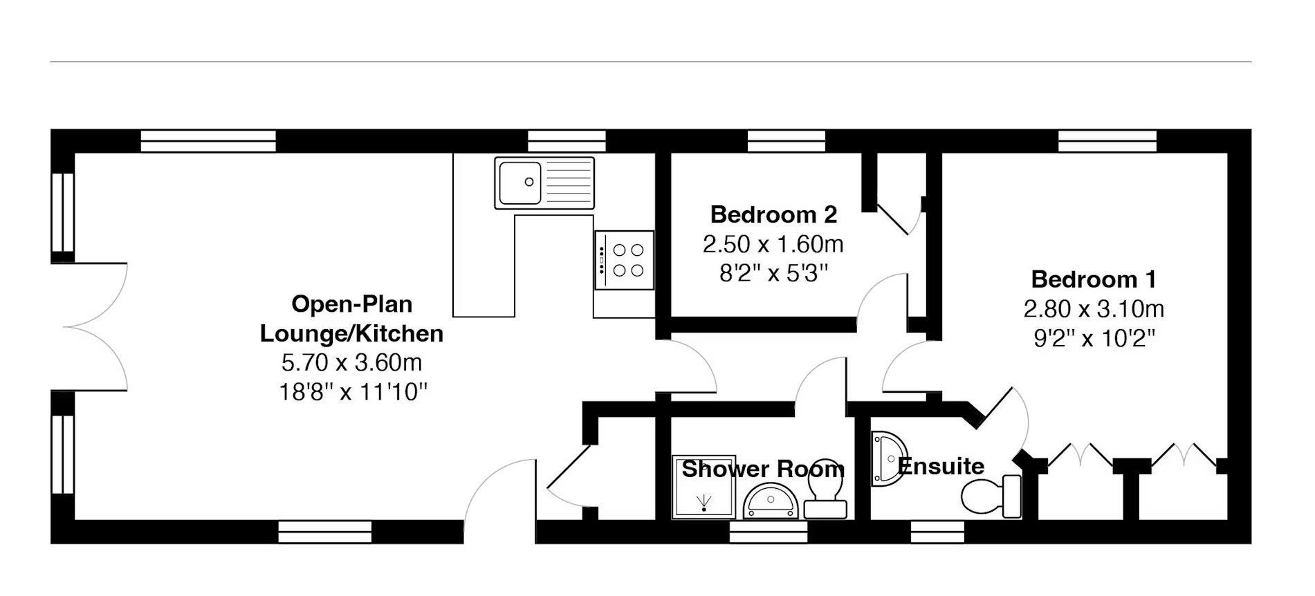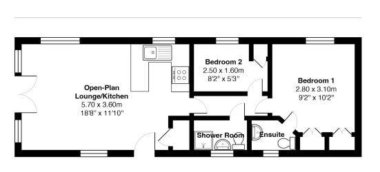 The accommodation includes a bright lounge area, semi-open to a fully fitted, sleek kitchen, offering a modern and stylish living space. There are two well-proportioned bedrooms, making it perfect for couples, small families, or anyone wanting a guest room or home office, featuring a wardrobe and an en-suite toilet. A modern shower room completes the interior, ensuring all your needs are met.